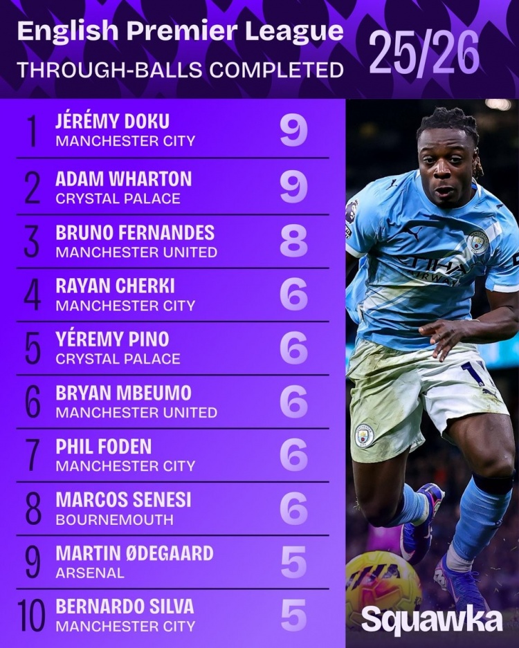 本赛季英超成功直塞榜:
